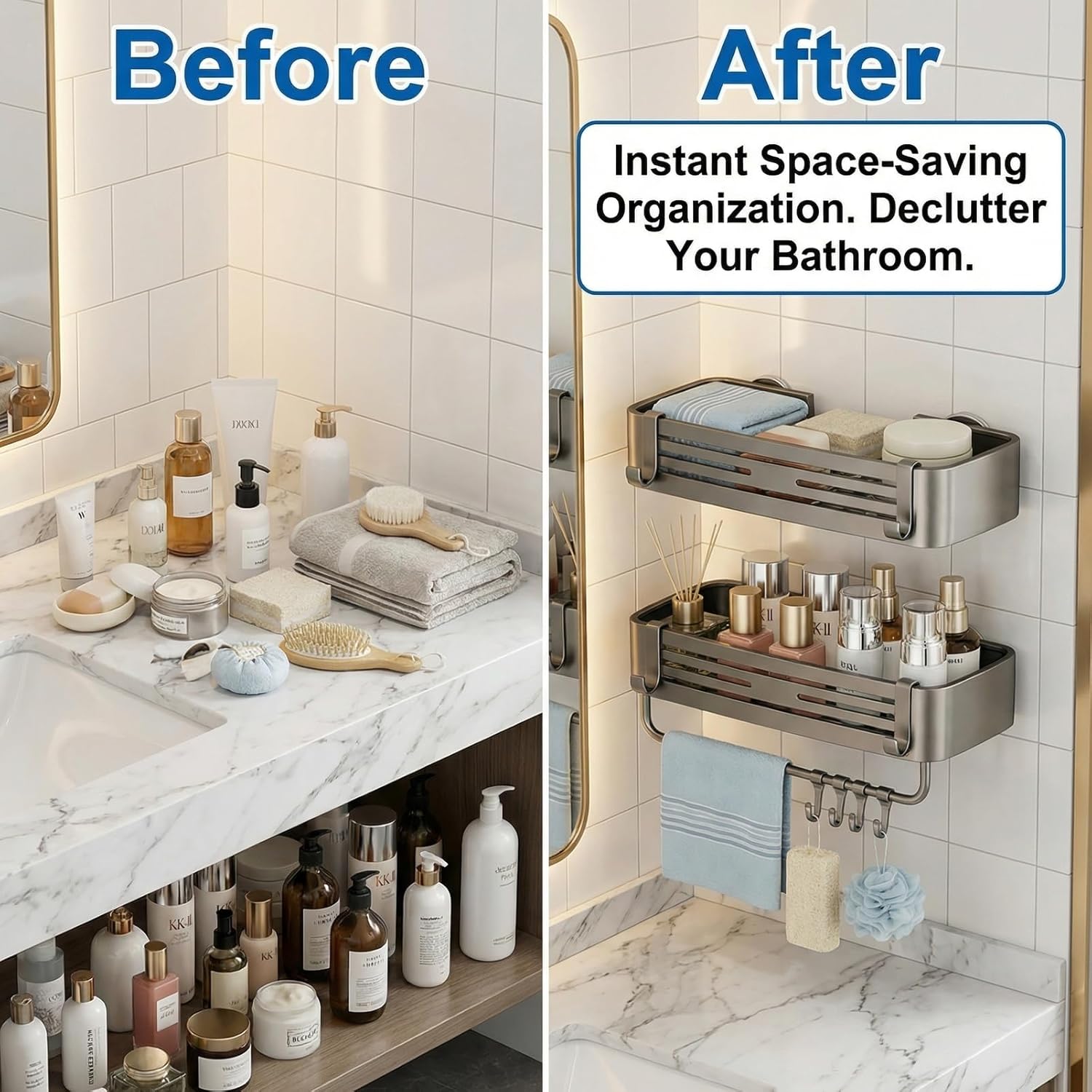 Declutter & Organize. Gun Gray Double-Layer Bathroom Wall Shelf Upgrade your shower space with our premium aluminum wall shelf. Designed with a modern gun gray finish, this versatile organizer (13.19x6.30x3.35 inches/33.5x16x8.5 cm) offers ample storage to transform any bathroom into a tidy, elegant retreat. Why Choose Our Bathroom Shelf? ✅ Maximized Storage: Features double-layer shelves with raised edges to keep shampoos, soaps, and toiletries secure. Includes movable hooks and a towel bar for hanging loofahs, razors, and towels. ✅ Built for Humidity: Made from rust-resistant aluminum, this shelf is engineered to withstand moist bathroom conditions while maintaining its sleek appearance. ✅ Effortless No-Drill Install: Secure it instantly with strong suction cups—no tools needed, no wall damage. Ideal for rentals or quick bathroom refreshes. Material: Premium aluminum with gun gray finish Dimensions: 13.19x6.30x3.35 inches/33.5x16x8.5 cm Design: Double-layer shelves, movable hooks, integrated towel bar, anti-slip raised edges Installation: Strong suction cups (no drilling required) Care: Wipe clean with a soft, damp cloth. Organize with Ease Tired of a cluttered shower? This all-in-one shelf set not only keeps your essentials within reach but also adds a modern touch to your bathroom. A simple, stylish upgrade for a cleaner, more functional space.
