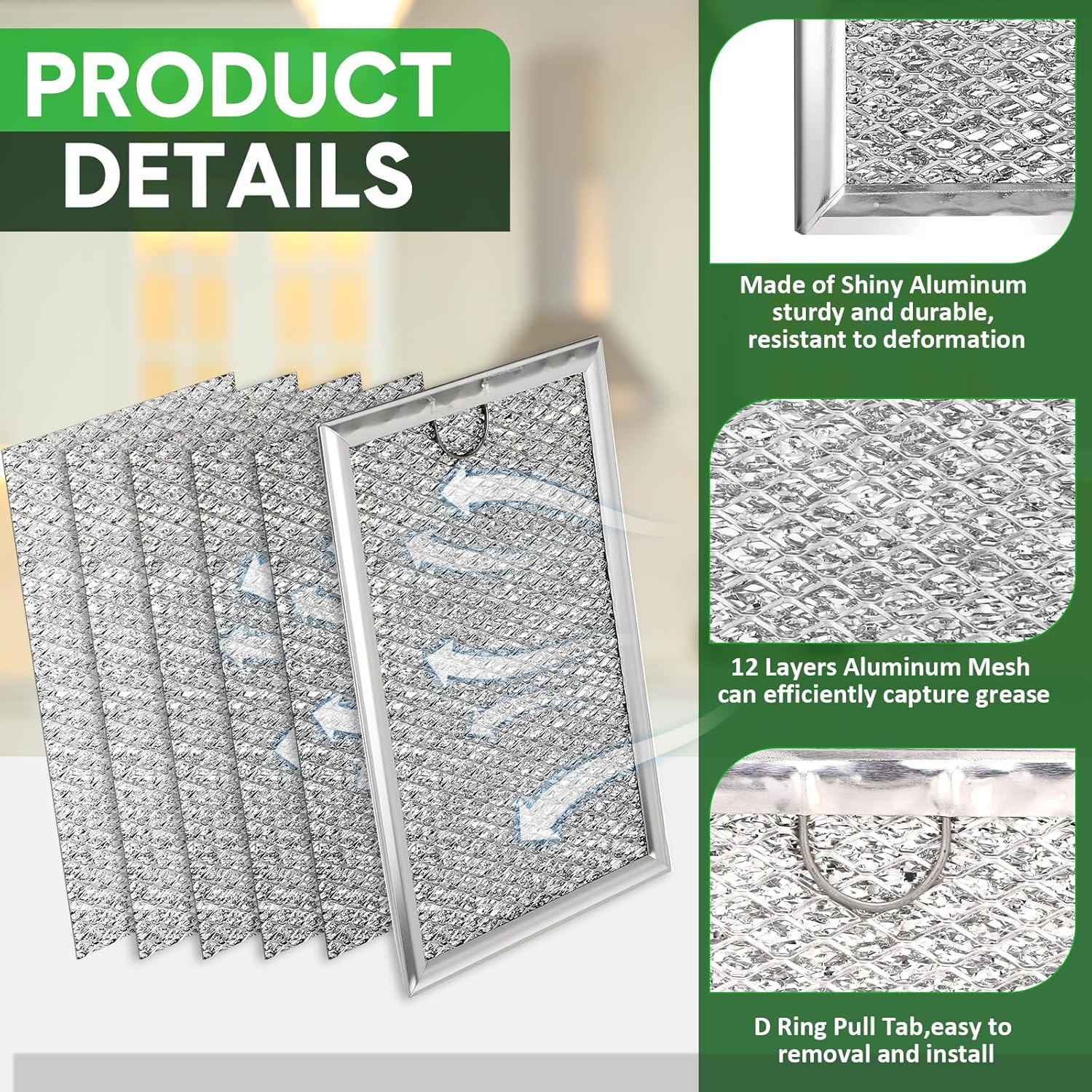 Features: Enhanced filtration: The microwave grease filter is expertly constructed and enhanced to be thicker than the industry standard enabling our microwave vent filter to stop more grease from entering. Fresh air: This microwave filter replacement ensures your kitchen is ventilated by ensuring your microwave vent fan is functioning at capacity by trapping grease in the filter. Specifications: Material: aluminum Color: silver Size: about 7.64 x 5.1 x 0.1 inches/ 19.4 x 12.9 x 0.25 cm Package includes: 12 x Microwave filter replacement Notes: Manual measurement, please allow slight errors on size. The color may exist a slight difference due to different screen displays