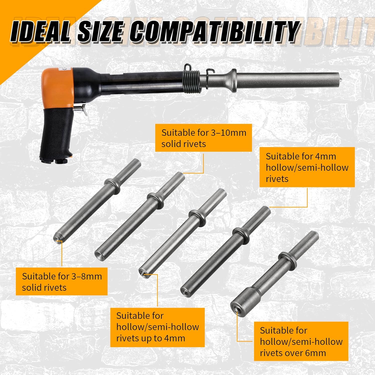 Package Includes: 1 x FLKQC 150mm Air Hammer Kit ( includes 1 x 150mm Air Hammer, 4 Chisels, Spring & 1/4" NPT Fitting) + 1 x FLKQC 7 Pcs Air Rivet Hammer Tools Kit. Features of FLKQC 150mm Air Hammer Kit Powerful 150mm Stroke & High BPM Performance:Delivers up to 4500 blows per minute with a 150mm (5.9 inch) long piston stroke, providing strong impact force for demanding cutting, chiseling, punching, and scraping tasks. Ideal for automotive repairs, metalworking, and industrial applications. Complete 4-Piece Chisel Punch Set:Includes a 4.93" x 1/8" taper punch plus three precision chisels—panel cutter, flat chisel, and spot weld chisel—each heat-treated for maximum durability. Covers a wide range of tasks from muffler removal to body panel cutting. Heavy-Duty & Durable Construction:Built with a rugged aluminum alloy body, heat-treated steel barrel, and high-quality movement for long service life. Alloy springs resist breaking and deformation, while the fully polished handle ensures a comfortable grip. Quick Accessory Changes & Adjustable Operation:Features a quick-change spring retainer for fast bit swaps, a standard 1/4" air inlet, and an air pressure adjustment knob for precise control. Built-in filter prevents debris from entering and damaging the tool. Versatile for Multiple Applications:Perfect for metal cutting, chipping, scraping, welding slag removal, stone/concrete opening, and more. Suitable for mechanics, construction workers, and DIY enthusiasts who need reliable pneumatic hammer performance. Features of FLKQC Air Rivet Hammer Kit Comprehensive 7-Piece Air Rivet Hammer Kit: Comes with 6 heavy-duty pneumatic rivet hammer bits and 1 spring. Compatible with most air hammers, this versatile kit is ideal for working with solid, half-hollow, and hollow rivets—perfect for metal fabrication, riveting, and repair work.