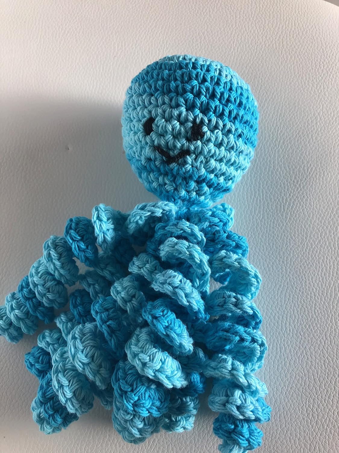 Crochet Octopus for Preemies, Crochet Octopus for Babies in Variegated Bright Blue color, is a great and wonderful gift for preemies babies. It's made with 100 percent cotton yarn and filled with polyester fiberfill and the eyes are embroidered (no loose parts hazard). The octopus is made in one piece. The length is almost 9 inches from a free tobacco smoke home. Preemie babies and babies like octopus because they remember the umbilical cordon and feel comforted. This idea come from Denmark, where a father asked for a crochet octopus for his baby. The nurses noticed that the baby pulled the tentacles instead the tubes, improving his health rapidly.
