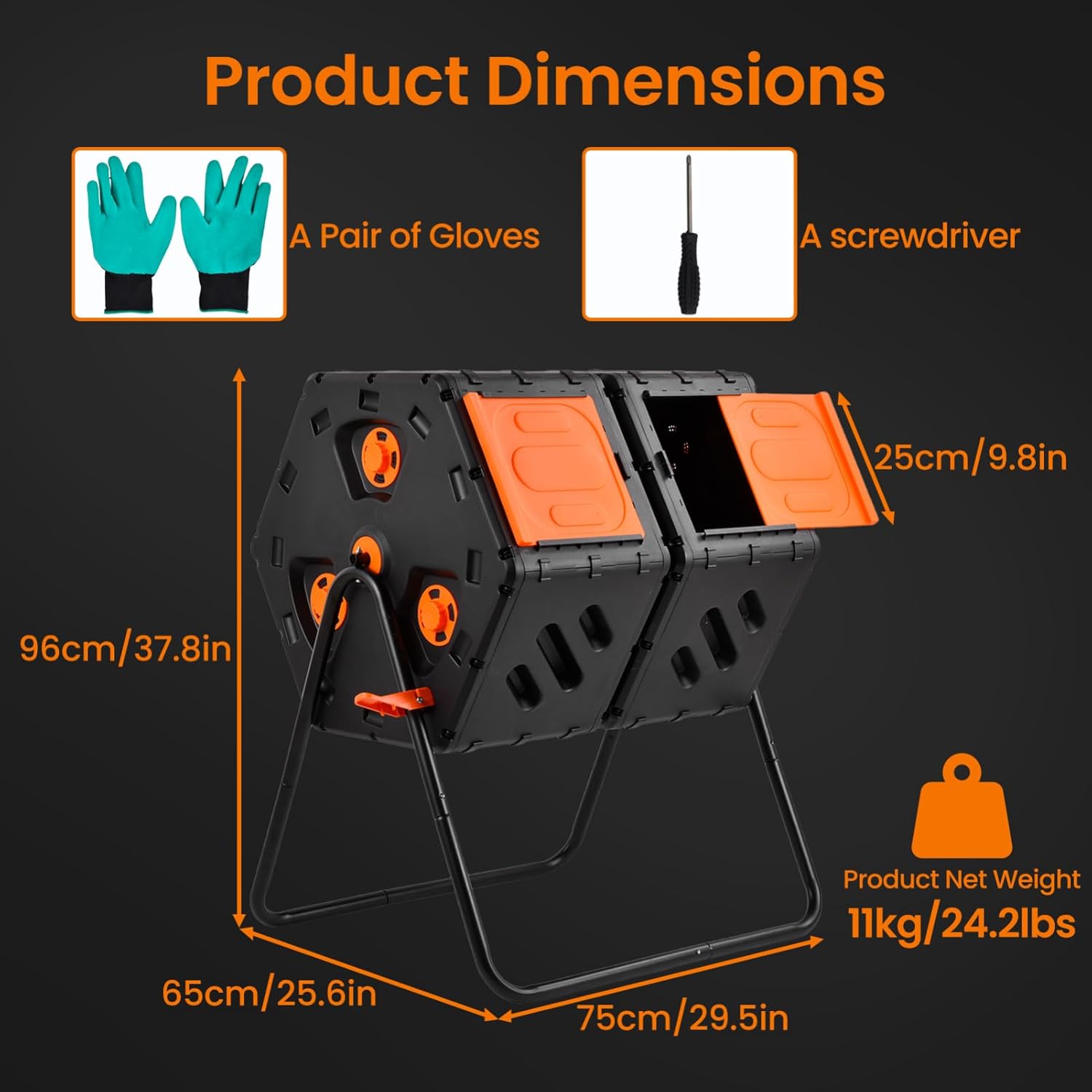 Efficiently manage garden, kitchen, and yard waste with the High Volume Double Chamber Rotating Tumbling Composter. Designed for gardeners seeking convenience, this composter features a raised base that ensures easy access and improved airflow for faster decomposition. The two chambers allow for continuous composting cycles, enabling users to add fresh waste to a single side while the other matures. Its rotating mechanism simplifies the mixing process, promoting even decomposition without manual effort. Ideal for eco-conscious households, this composter supports sustainable practices by turning organic waste into nutrient-rich compost. Durable construction ensures reliable performance in various outdoor environments, making it a valuable tool for maintaining healthy gardens and reducing landfill contributions. Enhance your composting experience with a solution tailored for efficiency and usability.SpecificationProduct name: Compost TumblerColor: orangeProduct Size: about 75x65x96cm/29.5x25.6x37.8inMaterial: new material PP + steel tubeWorking principle: aerobic fermentationApplicable raw materials: organic kitchen waste, garden leaves, vegetable leftovers, fruit peels, etc. (bones, nut shells and other difficult-to-decompose materials are not applicable)Packing List:1* Composter Tumbler OutdoorNotes:1. Due to different lighting and screen settings, the item color may be slightly different from the picture.2. Due to different manual measurements, please allow a 1-2cm difference in size.