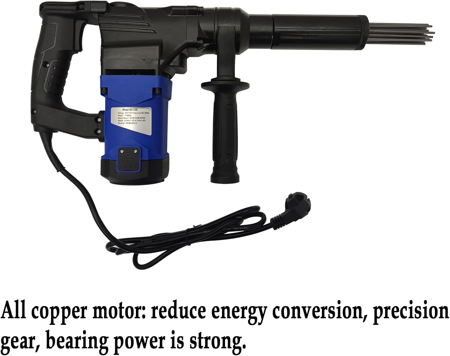 Parameters:Voltage: AC110VFrequency: 50/60HzPower: 1100WSteoke Speed: 3200-3400 B.P.MNeedle: Φ3mm*180mm*23pcDuration: 30Min(Max)Gift: 100 needles(3*180mm)Item Included: 220532Electric handheld rust remover 110V