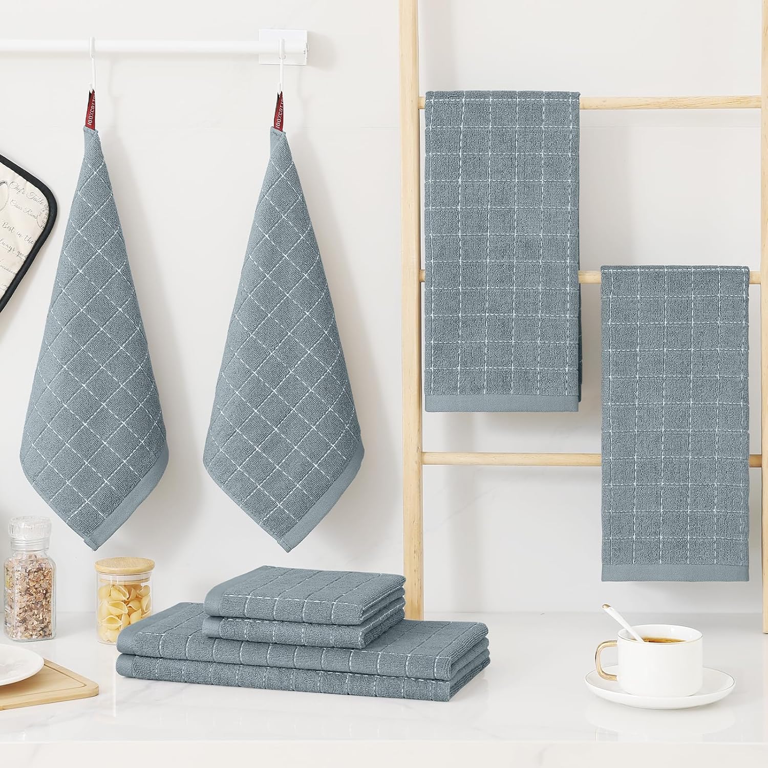 • VALUE PACK AND EASY TO STORE: The collection includes 4-pack cotton dishcloths and 4-pack cotton dish towels, measuring 12 x 12 inches and 13 x 28 inches, the perfect size for your daily needs.