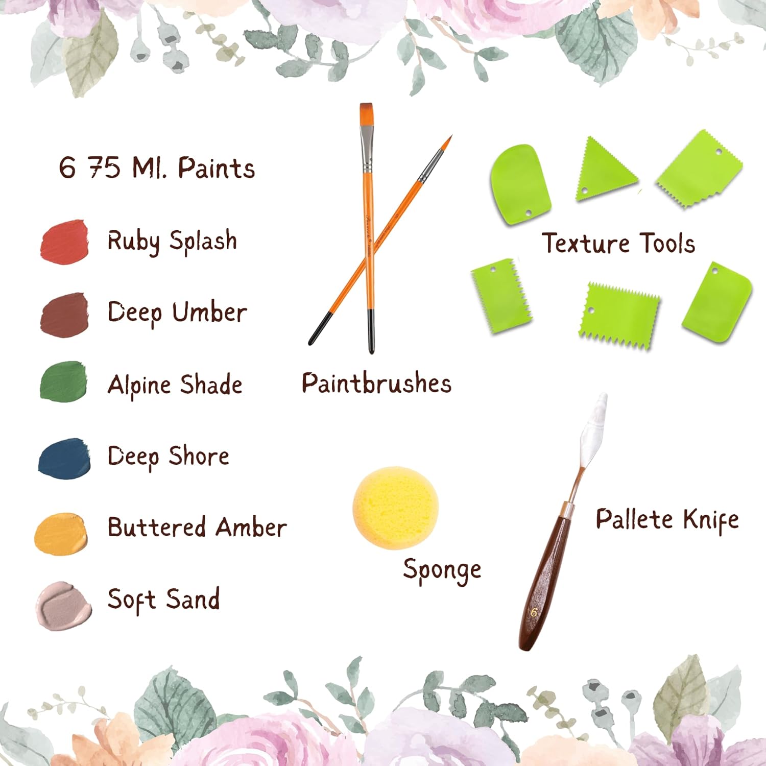 | Included Components | canvas, texture paste, paint brushes, acrylic paint set (6 colors), tools, instruction booklet |