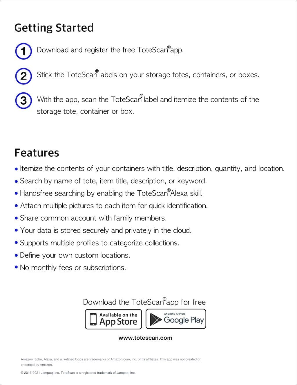 ToteScan: Revolutionize Your Storage, Find Anything in Seconds! Tired of endless searching through cluttered totes, bins, and boxes? Imagine instantly knowing what's inside every single container, without ever opening a lid! ToteScan is the revolutionary solution that transforms your home and business organization, making lost items a thing of the past. Buy in Bulk! And now, for the first time, ToteScan labels are available in bulk form! Each pack contains 25 pages, with 9 unique labels per page, giving you an impressive total of 225 unique ToteScan intelligent QR labels. This means you'll have more than enough to meticulously organize your entire garage, attic, or storage unit. Effortless Organization, Unmatched Convenience Whether you're tackling a big move, decluttering your home, managing small business inventory, or simply want to bring order to your garage, ToteScan is your ultimate organizational partner. Our innovative system makes itemizing and searching for your belongings incredibly fast and easy. How ToteScan Works Its Magic: 1) Stick & Scan: Simply apply a unique official ToteScan label to any container – totes, bins, boxes, you name it! Then, use the ToteScan mobile app to scan the label. 2) Itemize with Ease: Quickly and intuitively list the contents of your container within the app. Add keywords, descriptions, and even photos for ultimate detail. 3) Search Smarter, Not Harder: Need to find something specific? Use the app to search by tote name, item keyword, or even by scanning the label directly. No more guessing games or wasted time! Dedicated to Your Success: Our ToteScan Promise At ToteScan, our customers are at the heart of everything we do – you're the reason we exist! We're committed to ensuring your experience is seamless and your organization revolutionary. Your Inventory Lifeline in Times of Disaster Life can be unpredictable, but your ability to recover shouldn't be. Imagine the unthinkable: a house or garage fire. With ToteScan, you have an instant lifeline. Simply open the ToteScan app and request a complete inventory of your documented belongings to be sent directly to your email. If you've used ToteScan to organize items in areas affected by loss, you can immediately forward that crucial information to your insurance agent, streamlining your claim and helping you get back on your feet faster. Globally Unique, Always Ready Every single ToteScan label ever created, and all that will be created in the future, are globally and worldwide unique. This means no two labels are the same, anywhere. You can rest assured that whether you purchase ToteScan labels today or years from now, they will always be ready to use and completely unique Share & Collaborate: Perfect for Families & Businesses ToteScan makes organization a collaborative effort! Our family sharing feature lets you share your private ToteScan account, allowing everyone to easily add, edit, and view the same data. This is also ideal for small businesses, enabling multiple employees to share the same account and access critical inventory information seamlessly. Hands-Free Searching with Alexa! Elevate your organization with the ToteScan Alexa skill! Simply enable the skill on any Amazon Echo device and enjoy hands-free searching. Just ask Alexa to find items in your totes, and she'll tell you exactly where they are. It's the ultimate convenience for a truly organized life. Unwavering Support, 7 Days a Week Should you ever encounter any issues with your ToteScan app or labels, we're here for you. Our dedicated support team is ready to answer your questions and assist you via email 7 days a week. Your peace of mind is our priority. Constantly Evolving, Thanks to You We believe in continuous improvement. We're always working to enhance our app and expand our offerings, and your feedback is absolutely essential to that process. Share your thoughts with us – together, we'll make ToteScan even better! Proudly Made in the USA: Quality You Can Trust At ToteScan, our commitment to quality and innovation starts right here at home. We're incredibly proud to say that ToteScan is genuinely Made in the USA. All manufacturing, design, engineering, as well as our servers and cloud infrastructure, all of it, in the USA. Stop Searching, Start Finding! It's time to take control of your physical storage. ToteScan doesn't just organize your totes; it changes the way you interact with your belongings, saving you time, stress, and frustration. Experience the freedom of effortless organization and finally find your stuff with ToteScan! Crafted with a powerful, long-lasting adhesive, these labels securely bond to a variety of surfaces, from sturdy cardboard boxes to most smooth plastic totes, guaranteeing your inventory stays precisely where you put it.