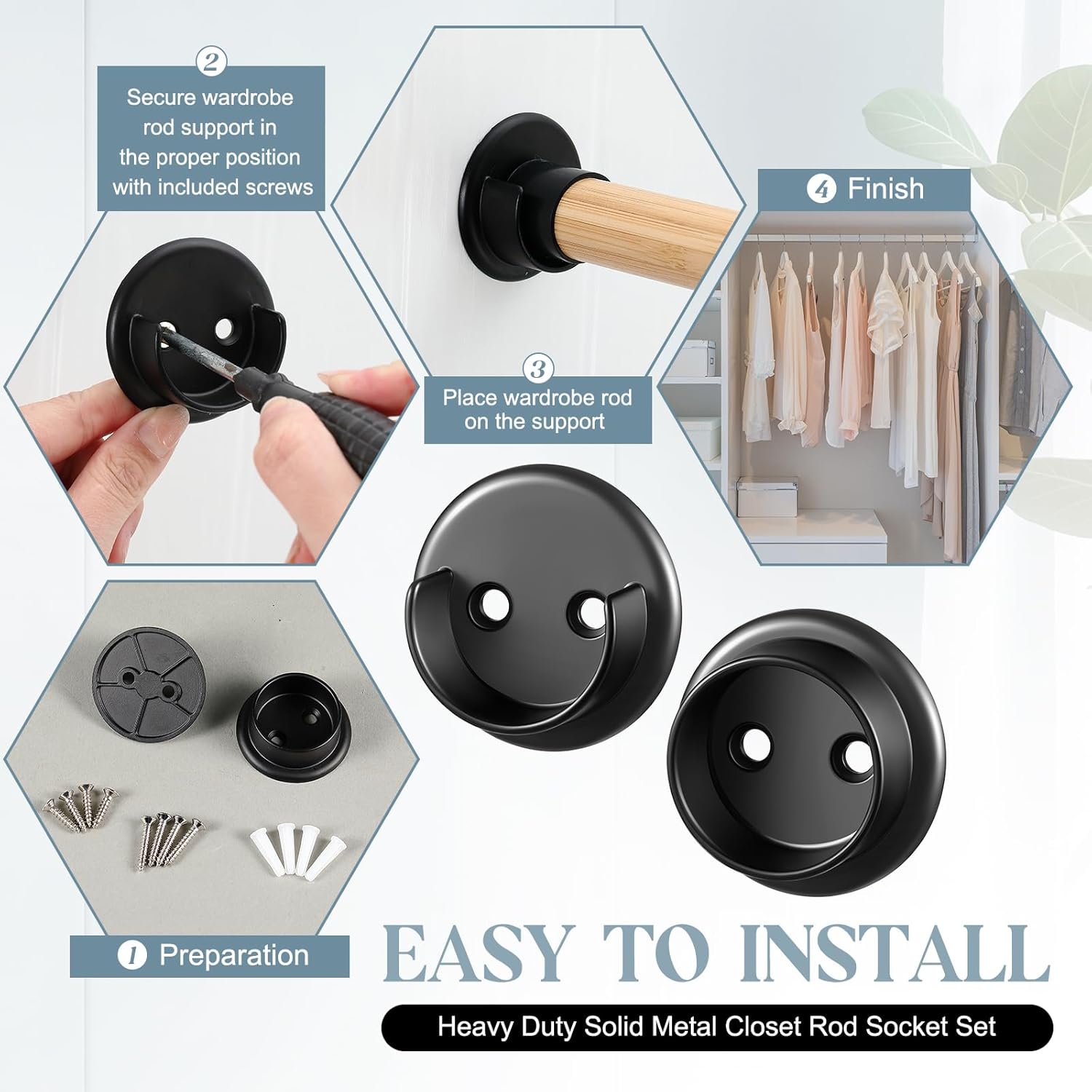 Features: The heavy duty closet rod bracket is designed to provide durability and stability, the result is a closet rod bracket that stays in place, no matter the weight. Our closet pole socket is crafted with quality metal ensuring a rust resistant and heavy structure, making it ideal for long term use. Specifications: Material: metal Color: as pictures shown Applicable size: rod with a diameter of 1-3/8" Short screw size: about #8X3/4" Long screw size: about #8x1" Quantity: 4 pairs Package includes: 4 Pairs of closet rod bracket support set Notes: Manual measurement, please allow slight errors on size. The color may exist a slight difference due to different screen displays. Pointed items are included, it is recommended to wear tool gloves to avoid injury when using and please keep it away from kids.